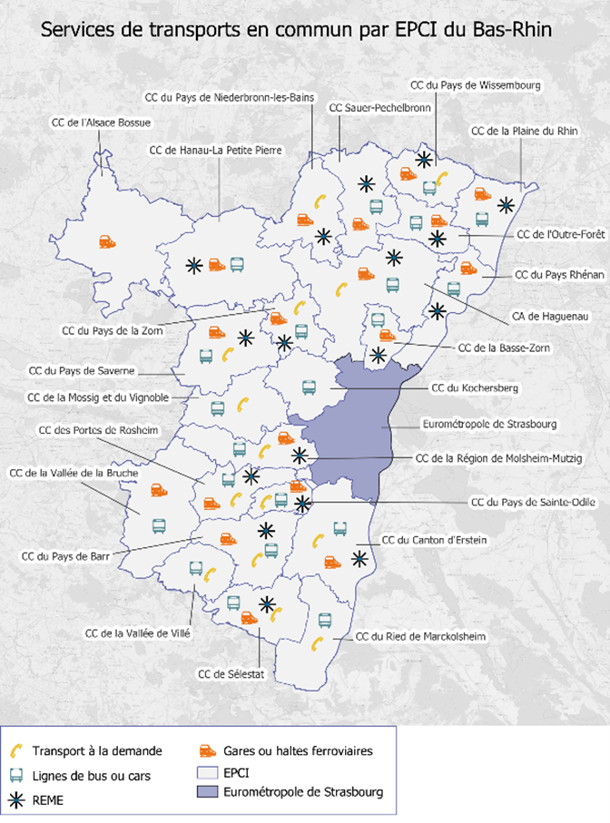 Une première phase de travail a permis d’établir un diagnostic de l’offre de mobilité dans l’ensemble du Bas-Rhin et une partie du Haut-Rhin. Ce diagnostic, coconstruit avec les Pôles d’Équilibre Territoriaux et Ruraux (PETR), les Communautés de Communes et les communes, recense les services et infrastructures de mobilité existants : covoiturage, autopartage, lignes de transport, transports à la demande, pistes cyclables, parkings relais, points d’accueil vélo, etc.