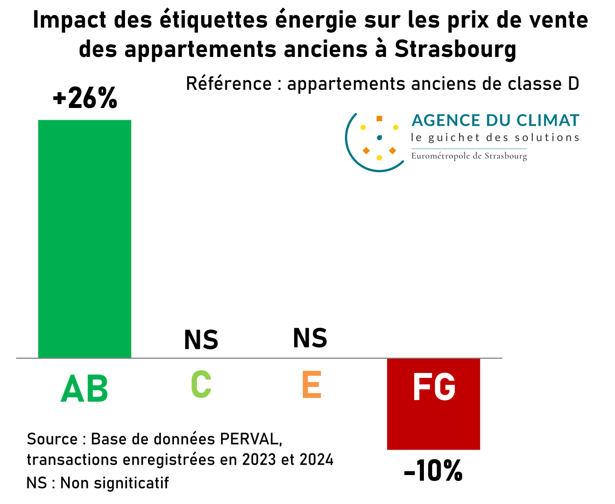 Ainsi, d’après la base de données PERVAL, sur les transactions enregistrées 2023-2024 (4420 transactions étudiées), un appartement ancien sur l’Eurométropole de Strasbourg classé F ou G (passoire thermique) est vendu 11 % moins cher qu’un appartement classé D, alors qu’un appartement classé A ou B est vendu 11 % plus cher !